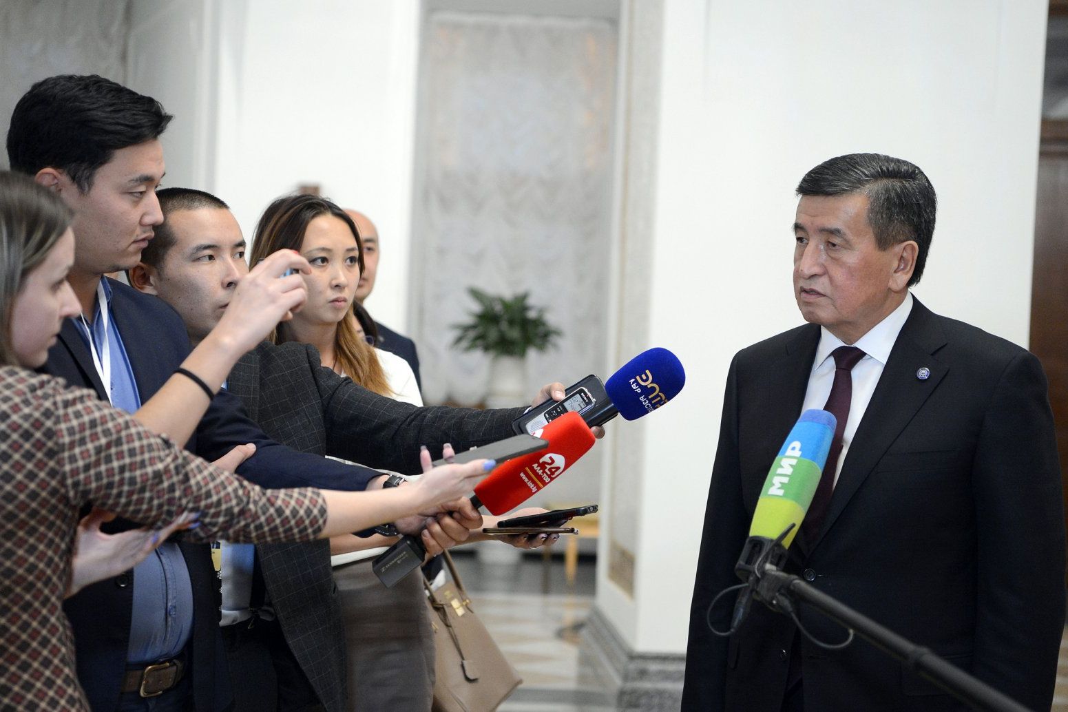 Президент Жээнбеков ноябрда Россияга бўлган расмий сафари вақтида пресса билан сўзлашмоқда. Сурат: Қирғизистон ҳукуматининг матбуот хизмати.
